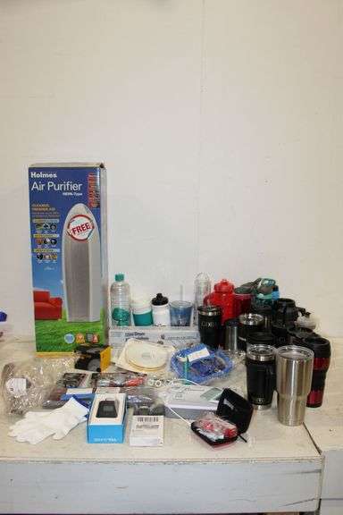 Holmes air purifier, travel mugs, mini dryer, sanitizer, gloves, cables, and accessories. Untested. Please see photos for more details. In overall good condition with finish wear. No other items included.