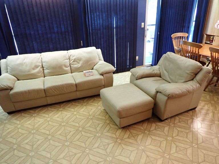 Italsofa living room set features a beige leather three-seater sofa, a matching armchair, and an ottoman. The leather structure provides durability and comfort. The sofa has a three-cushion design, while the armchair and ottoman offer a matching aesthetic. Measurements included in images for accurate sizing. Good overall condition with some signs of use visible.