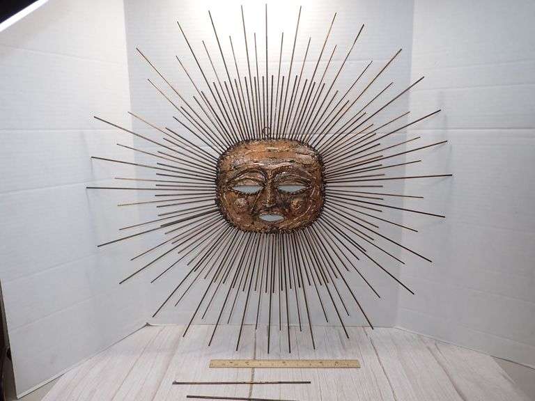 Handcrafted metal wall sculpture featuring a central mask with sunburst-style radiating rods. Constructed from mixed metals with a weathered appearance. The piece includes hanging hardware on the back for wall mounting. two rods appear loose or detached. Measures approximately 36 inches in diameter, with ruler shown for scale.