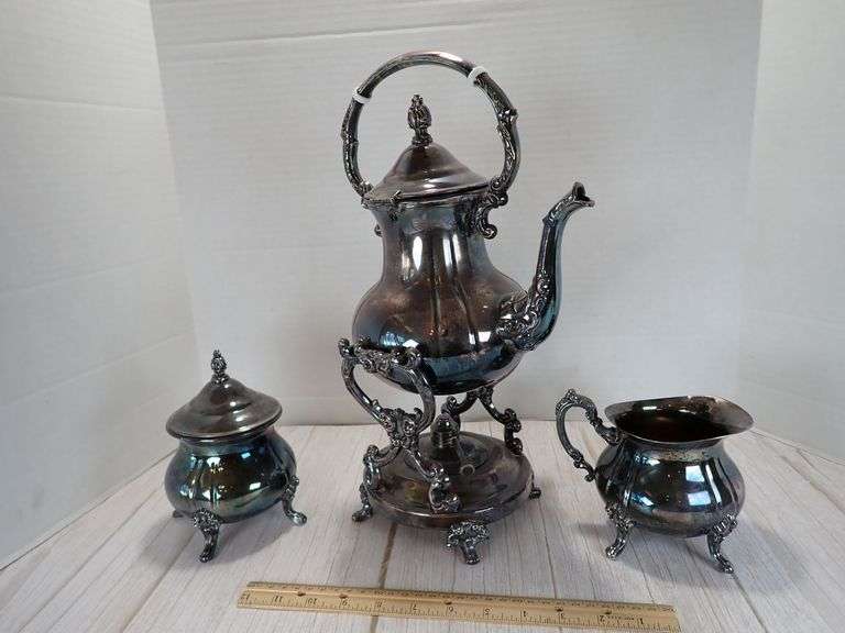 A Towle silverplate Tilting Tea/Coffee Pot set comprising a kettle with a hinged lid, matching sugar bowl with lid, and creamer. The tea kettle sits on a decorative stand with four ornate legs. Each piece features detailed feet and handles with intricate designs. All items are marked as silverplate.