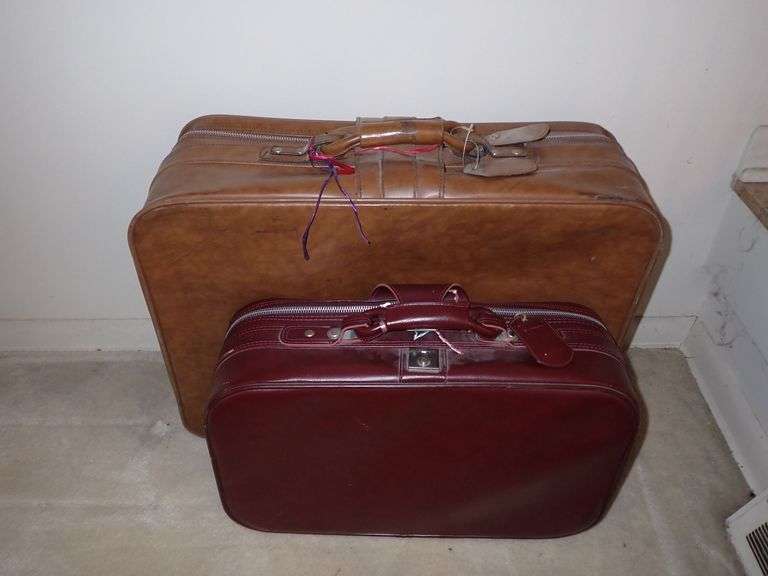 Vintage suitcases, including a large light brown leather Airway suitcase and a smaller maroon vinyl suitcase. Both feature zippered closures, sturdy handles, and reinforced corners. The leather suitcase displays a buckled strap detail, while the maroon suitcase highlights a red and black stripe accent. Both show wear, Suitable for decorative or practical uses.
