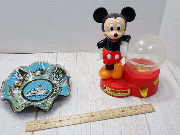 A Mickey Mouse gumball-style coin bank with a red and yellow base, made by Superior Toy & Manufacturing Co., Inc., featuring a clear coin compartment. Also included is a scalloped-edge glass souvenir tray featuring scenes from Walt Disney World with colorful illustrations and gold accents. Both items are in used condition with wear consistent with age and use.