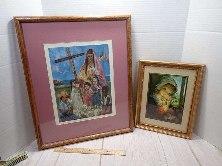 Framed religious-themed prints. The larger print features a group of people with a cross, framed in an oak-tone frame with a pink mat, measuring approximately 19 x 15 inches including the frame. The smaller print depicts a mother and child, framed in a gold-tone frame with a beige mat, measuring approximately 12 x 10 inches including the frame. Both frames are in ready-to-hang condition.