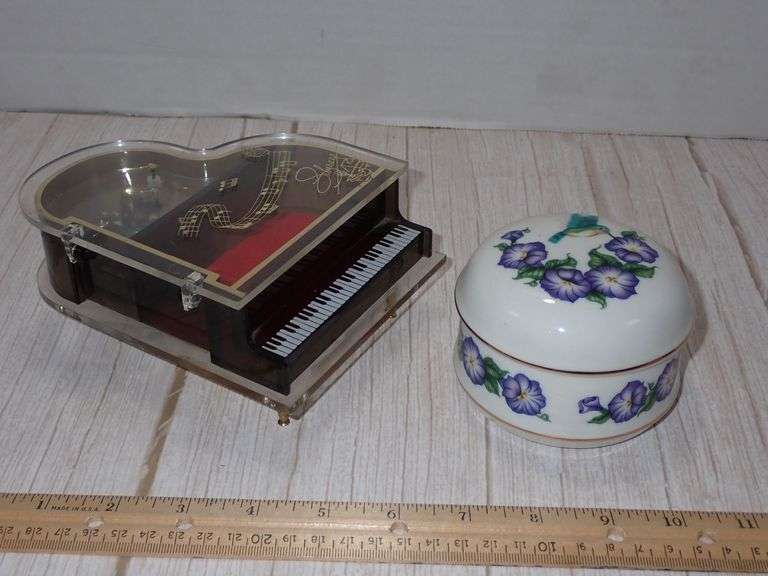 Two decorative music boxes. The first is a heart-shaped acrylic music box in the form of a baby grand piano with visible internal components, etched musical note patterns, and a red velvet-lined interior. The second piece is a ceramic circular music box produced by The San Francisco Music Box Company, adorned with purple flowers and a bird design. Both boxes include wind-up mechanisms for operation.