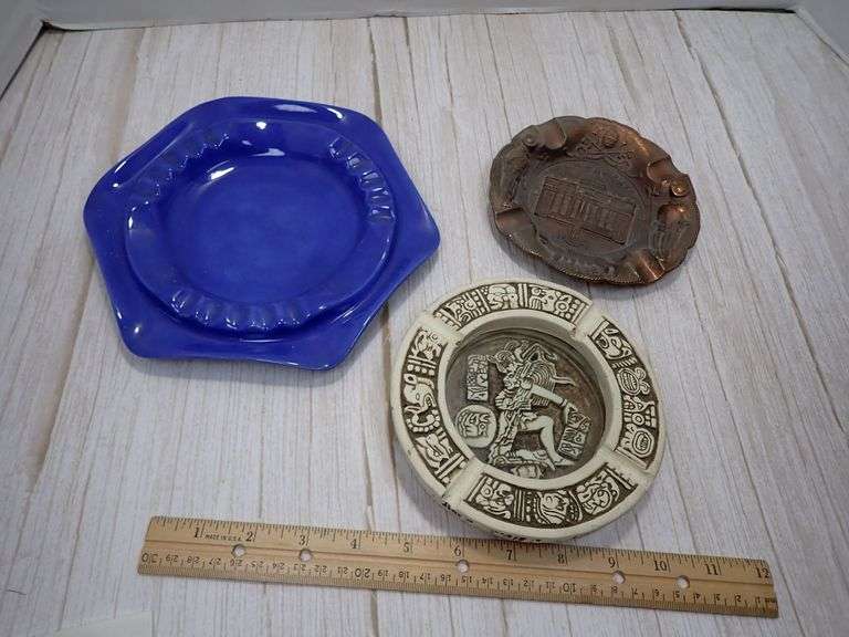 Three ashtrays, Includes a hand-decorated Mayan-inspired ceramic ashtray from Mexico, a copper or bronze ashtray featuring an embossed image of Basilica San Pietro in Rome, and a hexagonal ceramic ashtray in vibrant blue, signed ‘Pat 74.’ Each ashtray showcases unique craftsmanship and represents different cultural themes.