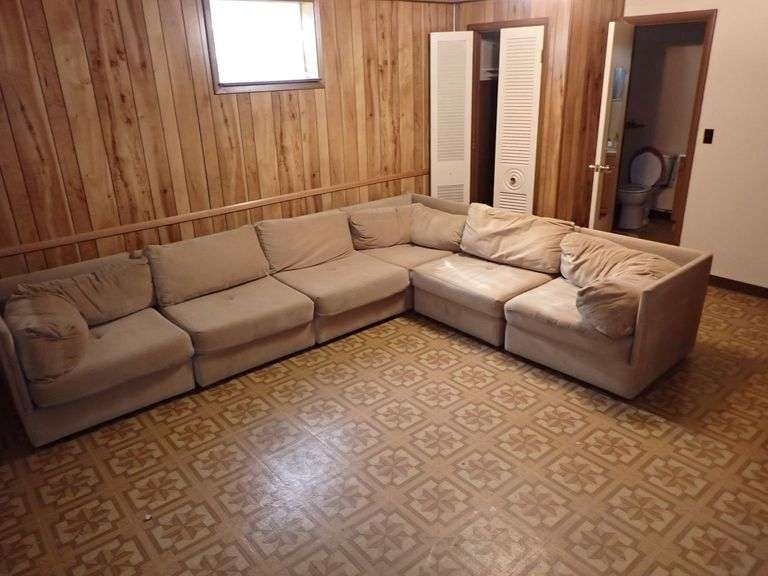 8ft x 11ft corner sectional sofa by Cri-Bon Fine Interiors – BEXLEY OHIO. Features an L-shaped design with modular segments and stone-colored upholstered fabric. The sofa shows signs of use, including wear on the cushions and fabric. Manufacturer’s tag is visible, confirming the maker. The piece offers ample seating, designed to fit snugly in corner spaces.