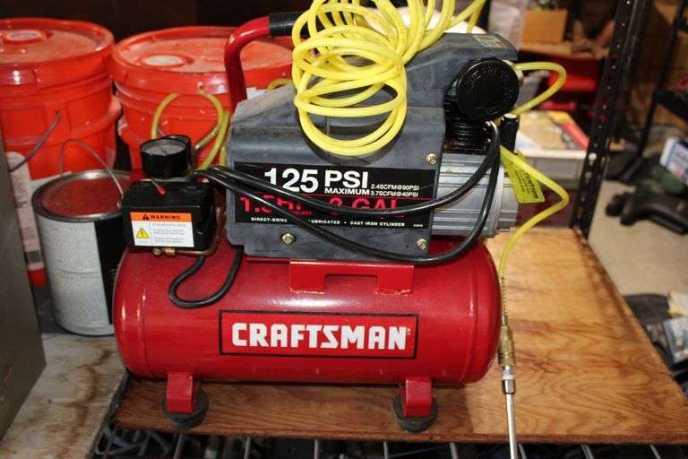 Craftsman 125 PSI 1.5HP air compressor with red tank and yellow hose, untested. Please see photos for more details. In overall good condition with finish wear. No other items included.