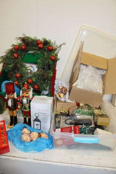 Fabulous Christmas decor including wreath with ornaments, nutcracker figures, lantern, tree ornaments, boxed lights, and assorted accessories. Please see photos for more details. In overall good condition with finish wear. No other items included.