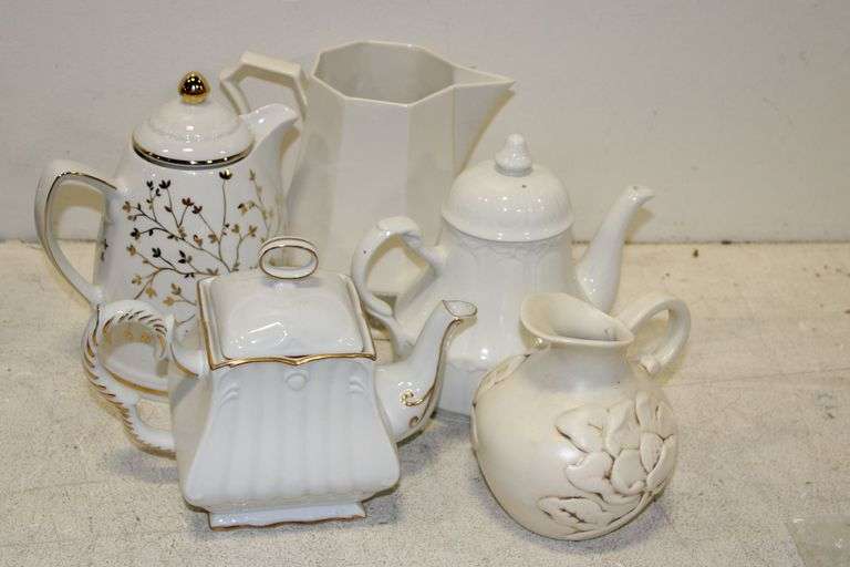 Lovely white porcelain pitchers and teapots including floral embossed and gold accent pieces. Please see photos for more details. In overall good condition with finish wear. No other items included.