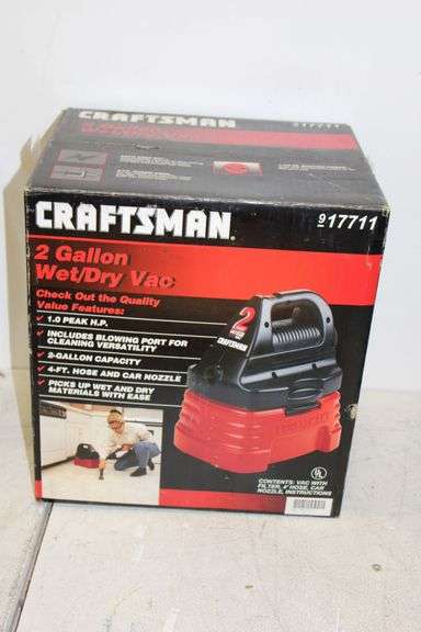 Craftsman 2 gallon wet/dry vac with 1.0 peak horsepower, blowing port, 4-ft hose, and car nozzle, untested. Please see photos for more details. In overall good condition with finish wear. No other items included.