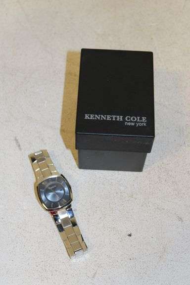 Wonderful wristwatch by Kenneth Cole with silver-tone case, blue/gray face, and silver-tone matching bracelet band, includes original box. Untested. Please see photos for more details. In overall good condition with finish wear. No other items included.