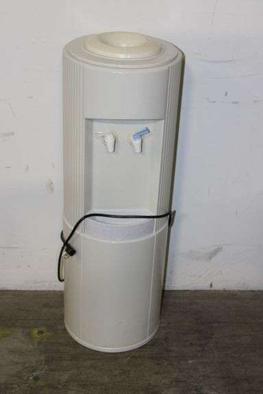 Electric water cooler dispenser with white cylindrical body and two spigots, untested. Please see photos for more details. In overall good condition with finish wear. No other items included.