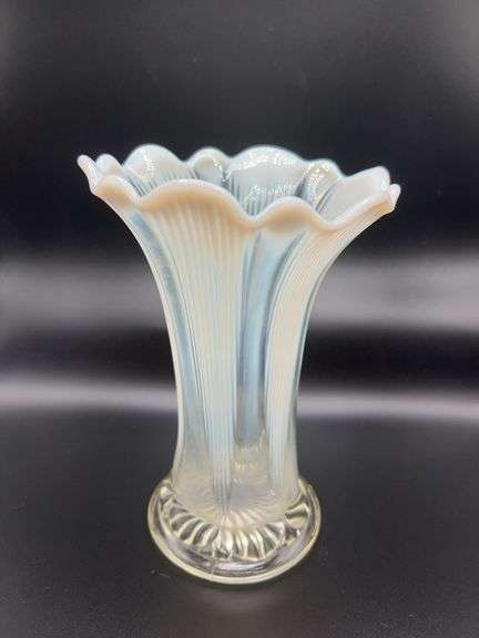 Northwood White Opalescent Vase with graceful ruffled top. Flea bite on rim. See photos for details.