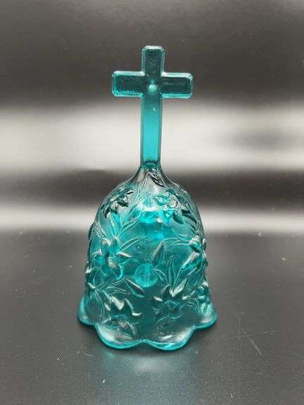 Fenton Teal Blue Bell with Easter Lillies and Cross Handle. Has clapper. No condition issues noted. See photos for details.