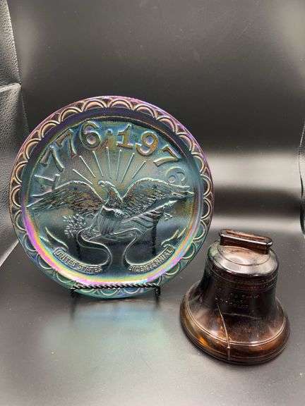 Indiana Blue Carnival Glass Bicentennial Plate and Anchor Hocking Liberty Bell Bank. No condition issues noted. See photos for details.