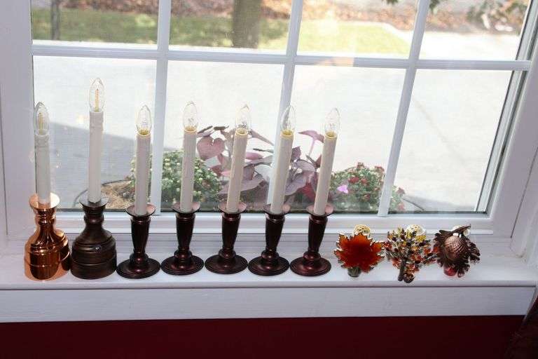 Set of seven battery window candles with various metal-tone bases, and decorative Autumn scent plug-ins. Untested. Please see photos for more details. In overall good condition with finish wear. No other items included.
