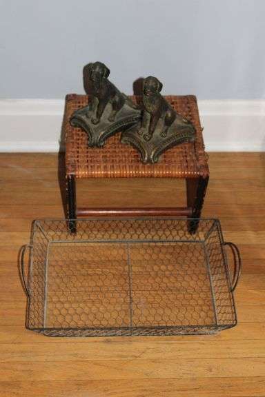 Cute pair of cast metal dog bookends with bronze finish ornate bases, woven footstool, and a rustic wire tray with handles; untested. Please see photos for more details. In overall good condition with finish wear. No other items included.