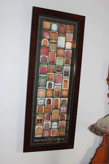 Napa Valley Winery Doors poster print featuring a collection of colorful vintage winery door photographs arranged in a grid. Please see photos for more details. In overall good condition with finish wear. No other items included.
