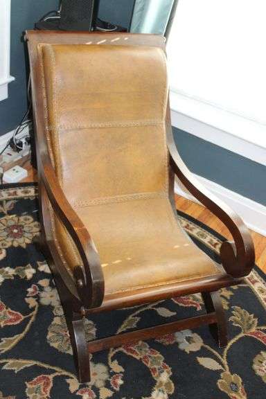 Wonderful Arts & Crafts leather sling chair with stitched seams, nail head trim, and curved wood frame. Please see photos for more details. In overall good condition with finish wear. No other items included.