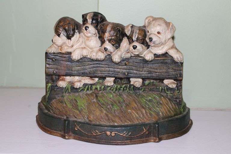 Cute cast iron doorstop depicting six puppies leaning over a wooden fence with painted details in shades of cream, brown, and black. Please see photos for more details. In overall good condition with finish wear. No other items included.