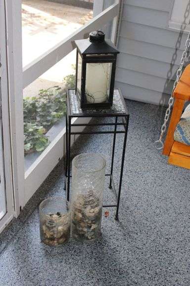 Charming metal and glass lantern with pillar candle on a tall stand accompanied by two crackle glass vases filled with decorative stones. Please see photos for more details. In overall good condition with finish wear. No other items included.