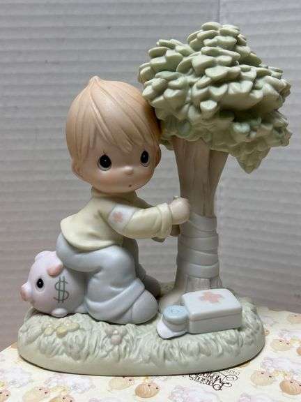 Precious Moments 1994 figurine titled 'Money's Not the Only Green Thing Worth Saving,' made by Enesco. This hand-painted porcelain bisque shows a child holding a tree with a piggy bank. Approximate dimensions are 5 inches tall by 5 inches wide. Signed on the base and marked with its title and Enesco copyright. Includes original box and pamphlet. This item(s) sells as is.