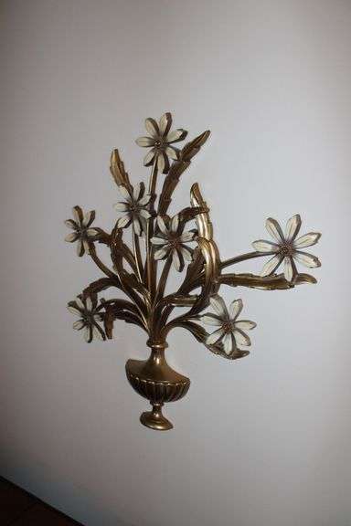 Lovely Hollywood Regency wall sculpture in the form of a floral bouquet with gold-tone metal vase and cream petals, offering dimensional detail and vintage charm. Please see photos for more details. In overall good condition with finish wear. No other items included.