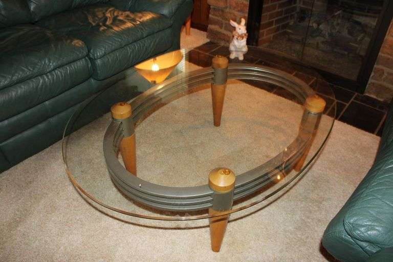 Stylish oval glass coffee table with clear beveled glass top, four tapered wood legs, and metallic cross supports. Please see photos for more details. In overall good condition with finish wear. No other items included.