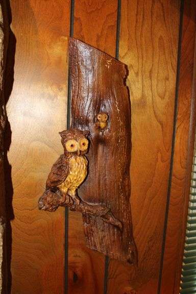 Cute hand-carved wood wall sculpture featuring a large owl and owlet perched on a naturalistic tree branch form. Please see photos for more details. In overall good condition with finish wear. No other items included.