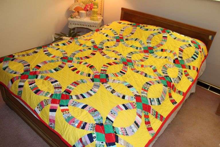 Bold calico quilt with ring pattern in yellow, red, green, and floral fabrics. Please see photos for more details. In overall good condition with finish wear. No other items included.