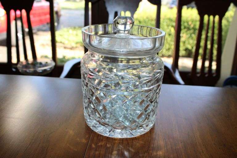 Wonderful crystal biscuit jar with lid, faceted knob, and diamond pattern body. Please see photos for more details. In overall good condition with finish wear. No other items included.