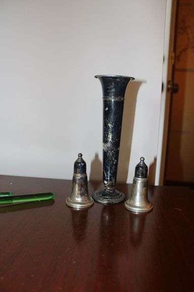 Terrific Classic weighted sterling silver bud vase with salt and pepper shaker set. Please see photos for more details. In overall good condition with finish wear. No other items included.