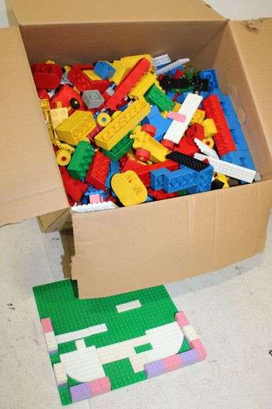 Fantastic large box of colorful Lego and Duplo plastic building blocks with assorted pieces and green base plate. Please see photos for more details. In overall good condition with finish wear. No other items included.