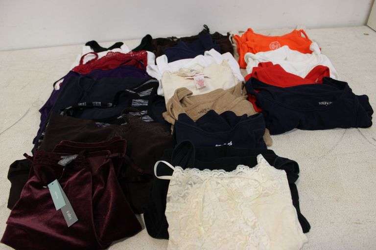 Wonderful variety of tank tops and camisoles including lace-trimmed, ribbed, and knit designs in assorted colors and materials. Please see photos for more details. In overall good condition with finish wear. No other items included. Size M.