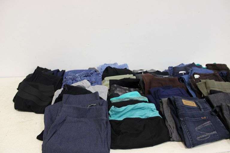 Stylish selection of women's pants including jeans, leggings, slacks, and casual trousers in various colors and fabrics. Please see photos for more details. In overall good condition with finish wear. No other items included. Size M & 8.