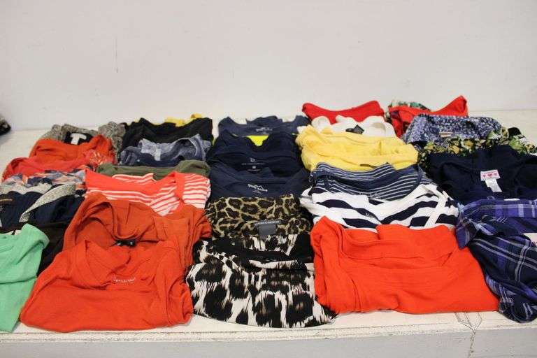 Pretty selection of women's designer casual tops and shirts in various colors, patterns, and fabrics including stripes, animal print, and solid designs. Please see photos for more details. In overall good condition with finish wear. No other items included. Size S.