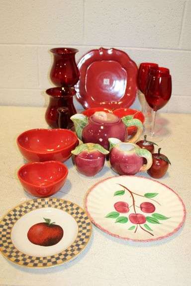 Fabulous decorative kitchen and tableware pieces including red glass vases, red bowls, apple-shaped sugar and creamer set, assorted plates, and goblets. Please see photos for more details. In overall good condition with finish wear. No other items included.