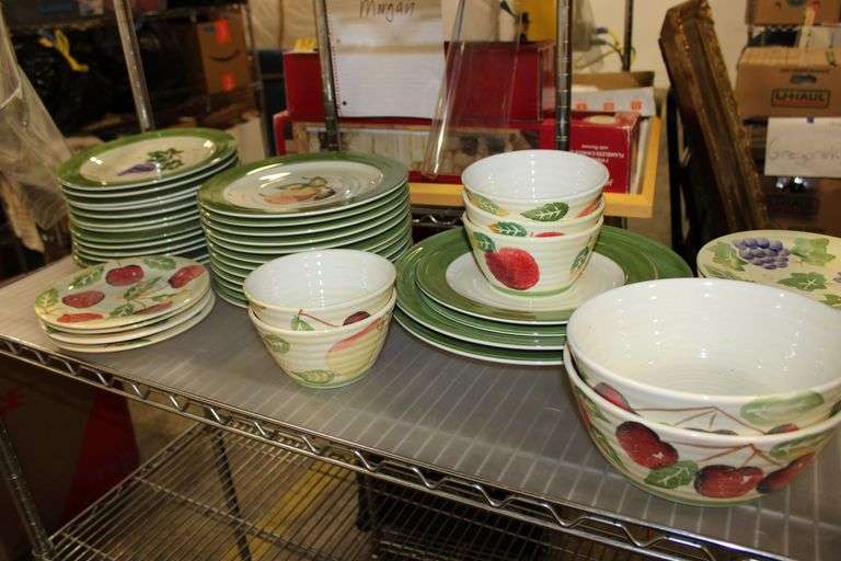 Lovely ceramic dinnerware set with fruit and leaf motifs including dinner plates, salad plates, and bowls with green borders. Please see photos for more details. In overall good condition with finish wear. No other items included.
