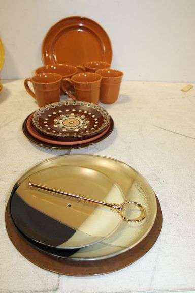 Terrific ceramic plates, mugs, saucers in earth tones with mandala accents, and tiered serving stand plates. Please see photos for more details. In overall good condition with finish wear. No other items included.
