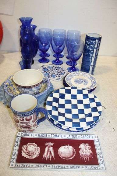 Fantastic blue glass goblets and vases, ceramic mugs, patterned plates, decorative vase, and serving tray with vegetable graphics. Please see photos for more details. In overall good condition with finish wear. No other items included.