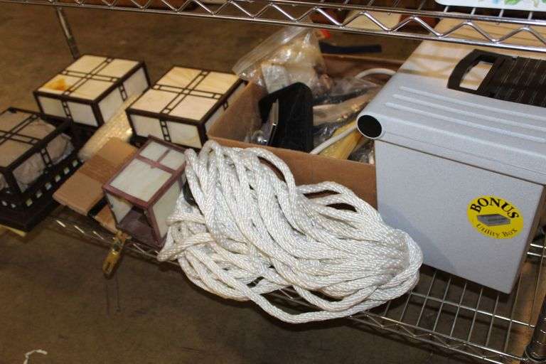 Mission style glass light fixtures, white rope, electrical parts, Bonus utility box, and hardware supplies. Untested. Please see photos for more details. In overall good condition with finish wear. No other items included.