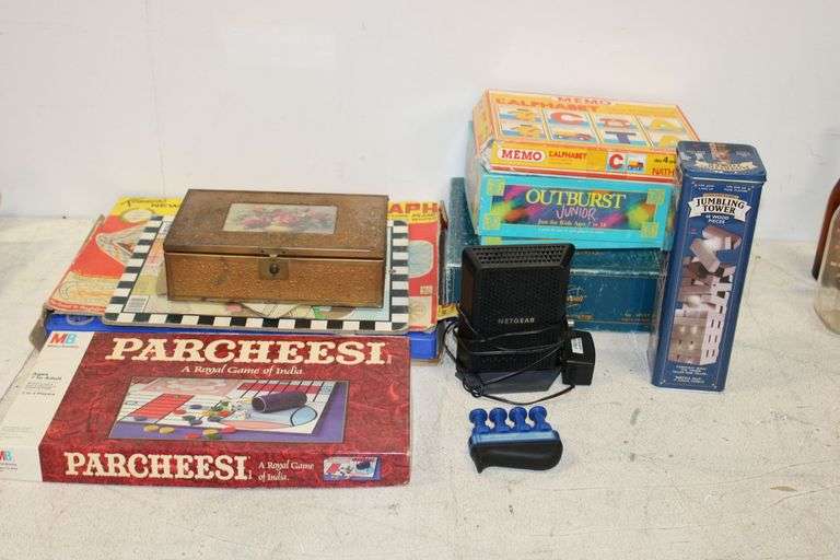 Fantastic group of board games including Parcheesi, Outburst Junior, Alphabet Memo, and Tumbling Tower along with a Netgear router (untested), vintage box, and assorted accessories. Please see photos for more details. In overall good condition with finish wear, games not checked for completeness. No other items included.