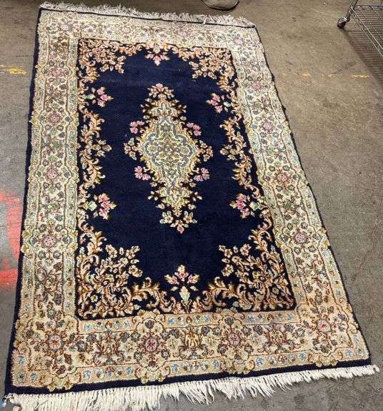 Hand-knotted Persian-style wool rug featuring a navy center with intricate floral motifs and beige border. Includes fringe at both ends, with wear visible on the fringe. Suitable for decorative or functional use.