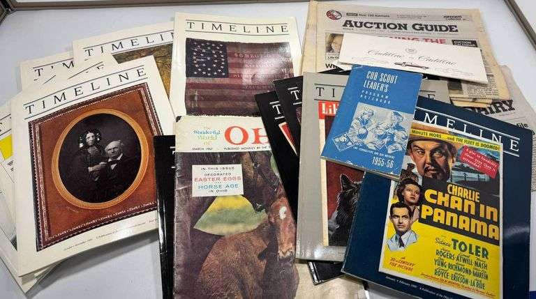 Lot including several issues of Timeline magazine, Cadillac brochures from 1985, auction guides, and other vintage printed materials like a Cub Scout Leader's Program Notebook (1955-56). Items are in generally good condition, showing minor wear.