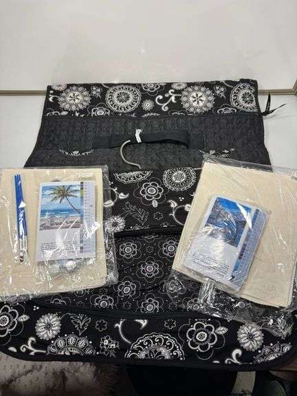 Two paint-by-number kits with brushes and color guides featuring scenic designs (palm tree on a beach and mountain landscape). Comes with a black-and-white patterned rolling storage case for portability and easy organization.