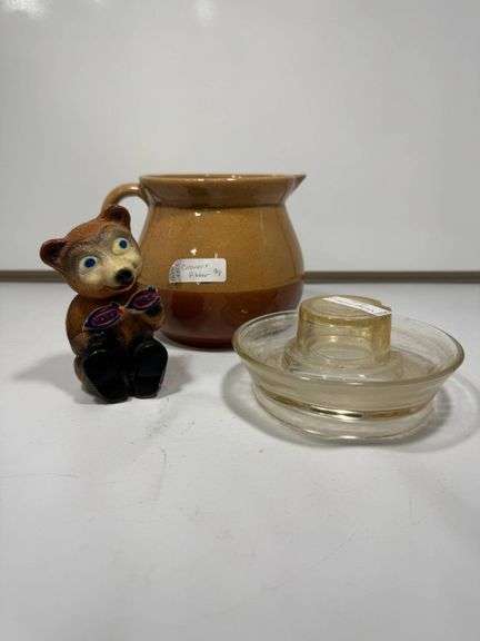 A Cabinart USA stoneware pitcher, marked on the bottom, a clear glass butter dish with lid, and a small bear figurine holding a logo. Items show minor wear consistent with age and use. No major damage noted.