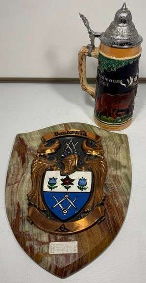 Includes a German beer stein with a lid depicting wildlife and marked 'Wildmanns Heil,' and a Brockworth family crest plaque with vibrant enamel details on a polished stone backing. Both items show minimal wear.