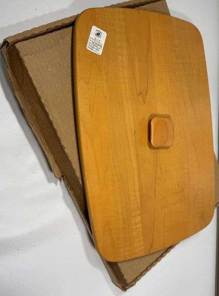 Longaberger wooden basket lid featuring a handle peg and marked with the Longaberger logo underneath. Made from light-toned wood, it comes with its original box. Excellent for fitting suitable Longaberger baskets.