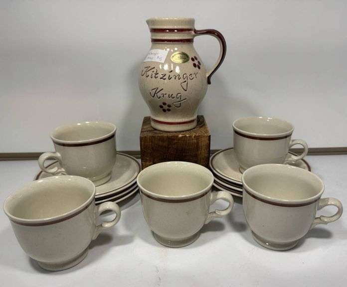 Stoneware set includes a ‘Kitzinger Krug’ pitcher and six cups with matching saucers. The pitcher is marked ‘Handarbeit’ with a capacity of 0.5L, while the cups and saucers are marked ‘Casual Elegance Hearthside Stoneware Japan.’ Good condition overall.