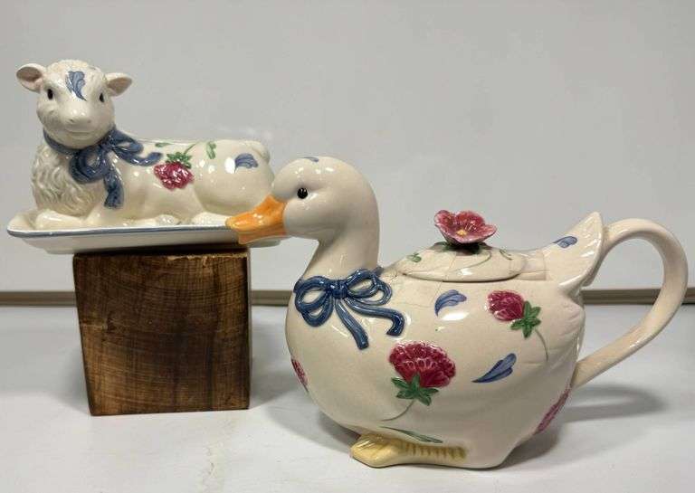 Lenoxceramic duck-shaped teapot with floral motif and a lamb butter dish, both featuring the ‘Poppies on Blue’ pattern. The teapot and dish are marked and in good condition with minor wear on the bases.